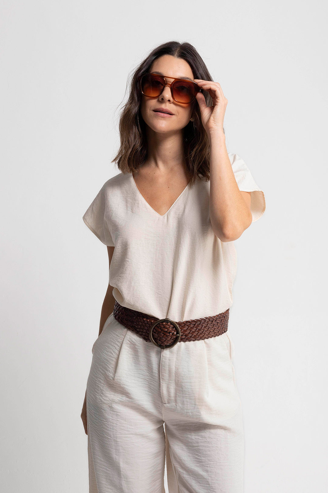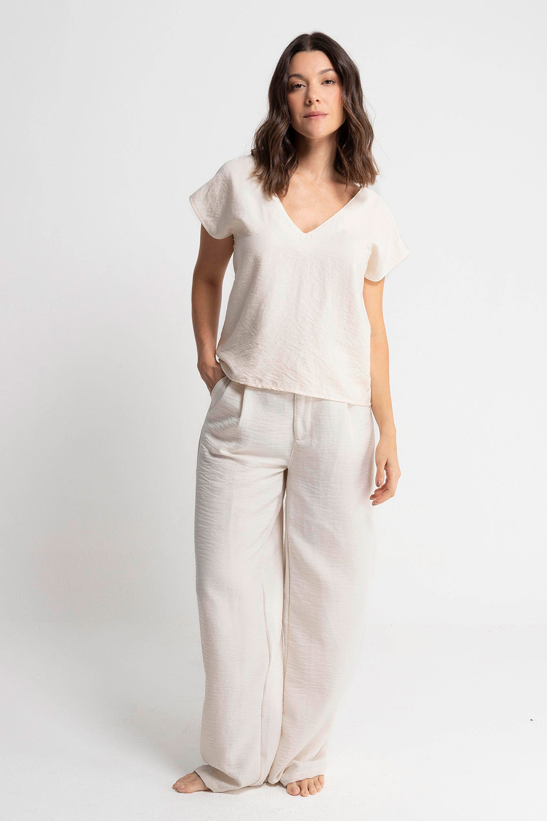 Nuestra camisa básica marfil para mujer, tienen una silueta amplia, confeccionada en rayón ligero que destaca por su frescura, caída natural y movimiento. Tiene escote en V al frente y en la espalda, que le da un toque sofisticado y diferente a un básico de todos los días.