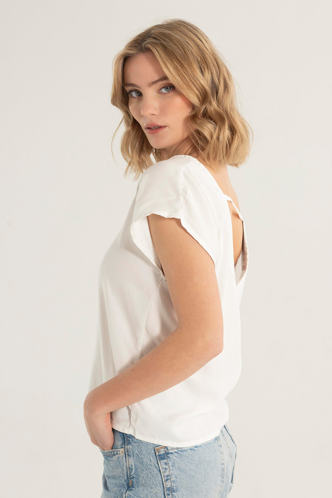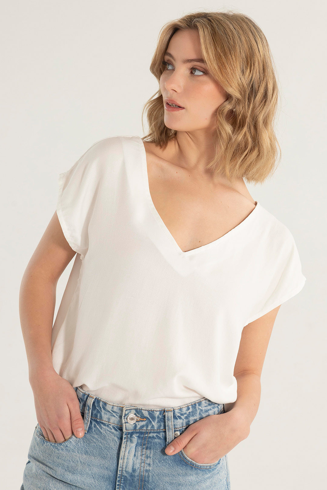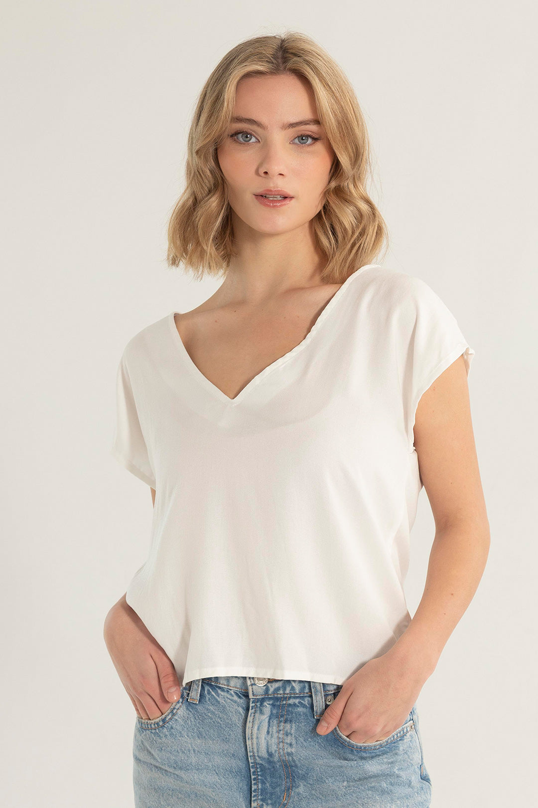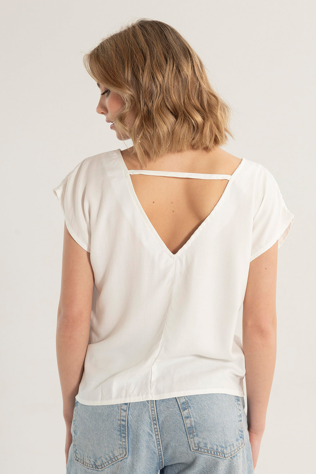 Nuestra camisa básica blanca para mujer, tiene una silueta amplia, confeccionada en rayón ligero que destaca por su frescura, caída natural y movimiento. Tiene escote en V al frente y en la espalda, que le da un toque sofisticado y diferente a un básico de todos los días.