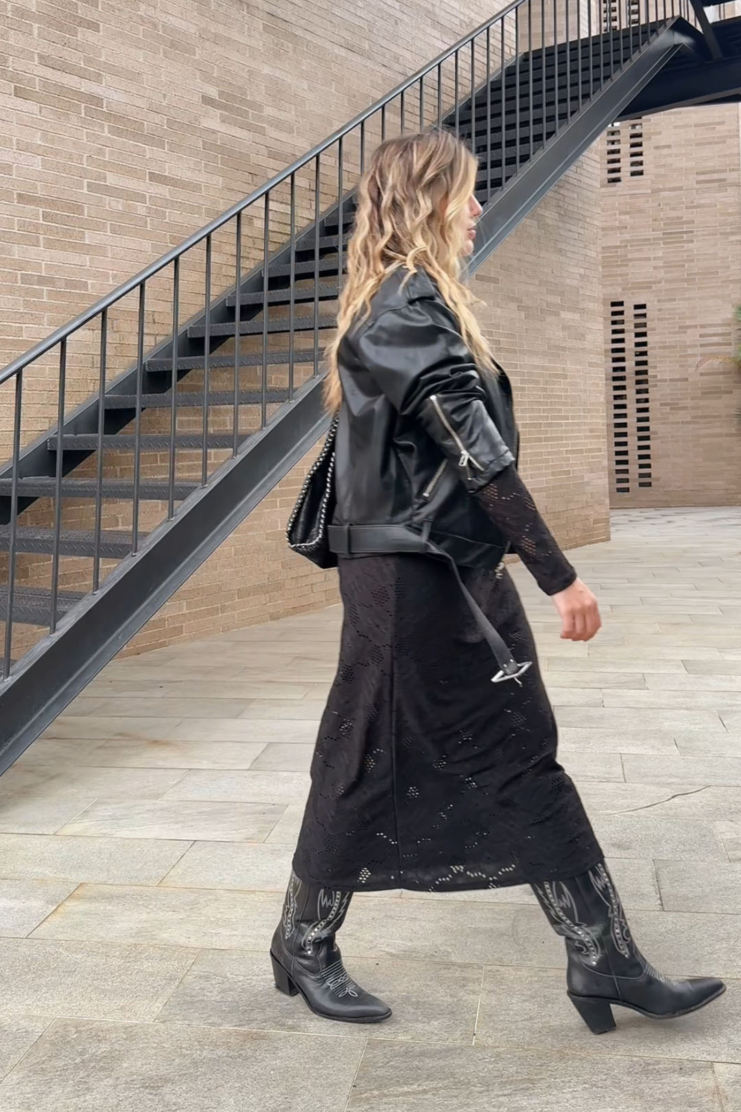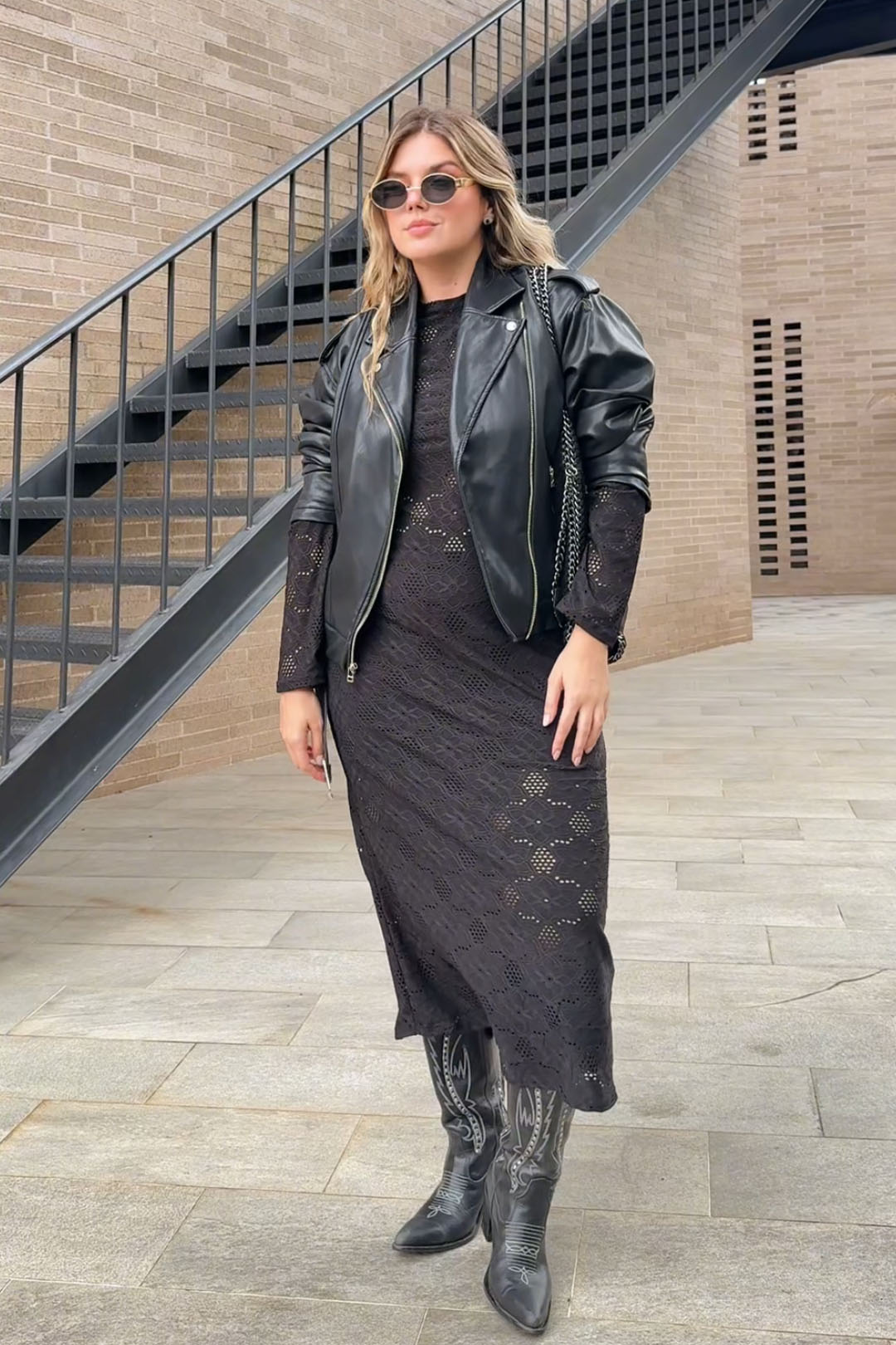 El Vestido Brenda Negro con mangas largas, cuello redondo, short interno y tela con textura floral. Su silueta es ajustada gracias a su tejido elástico y su largo midi estilizará tu look. Puedes llevarlo con botas para un look más versatil o con tacones para una ocasión elgante.