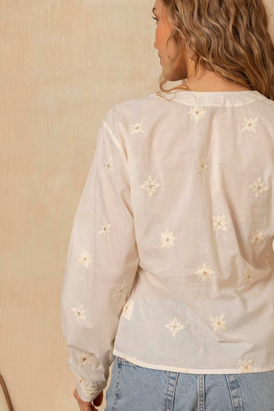 Características: • Cuello tipo V • Bordados florales en hilos dorados brillantes • Manga larga con puño ajustado • Cintura ajustable • Perfecta para looks casuales o más elegantes