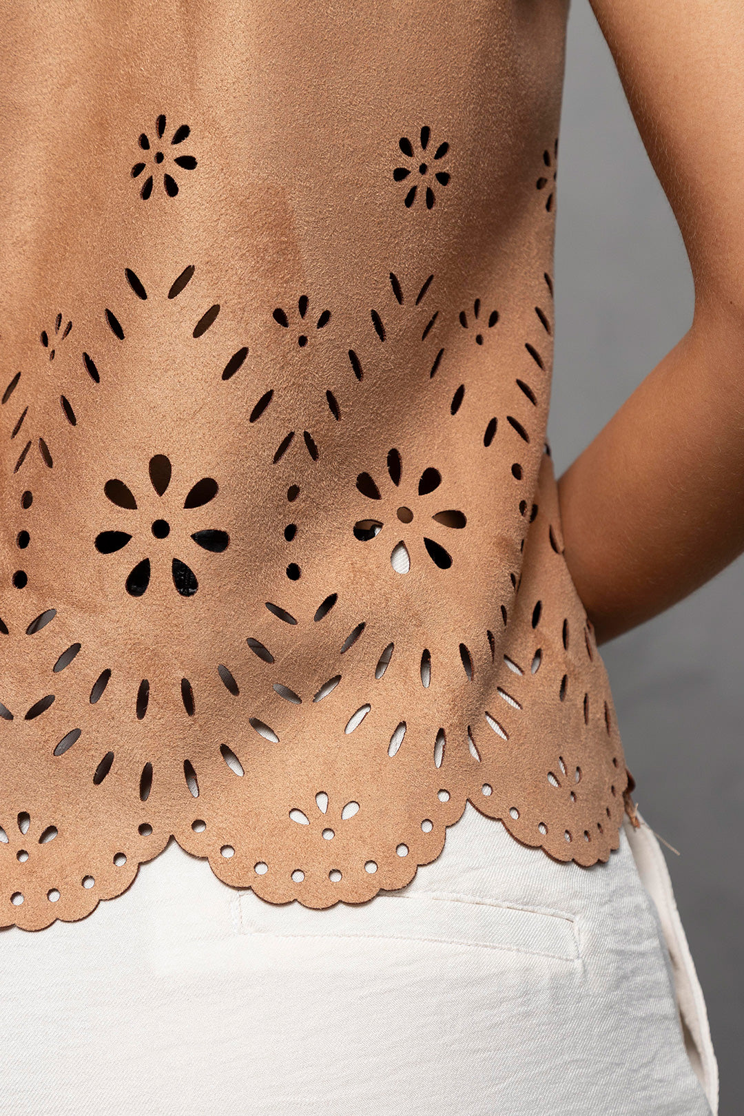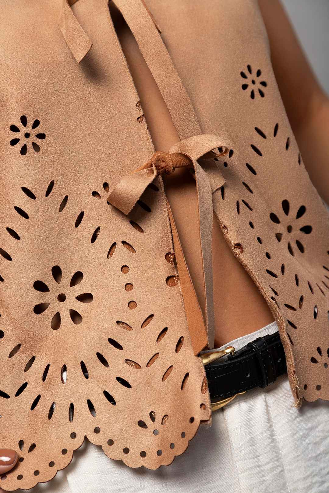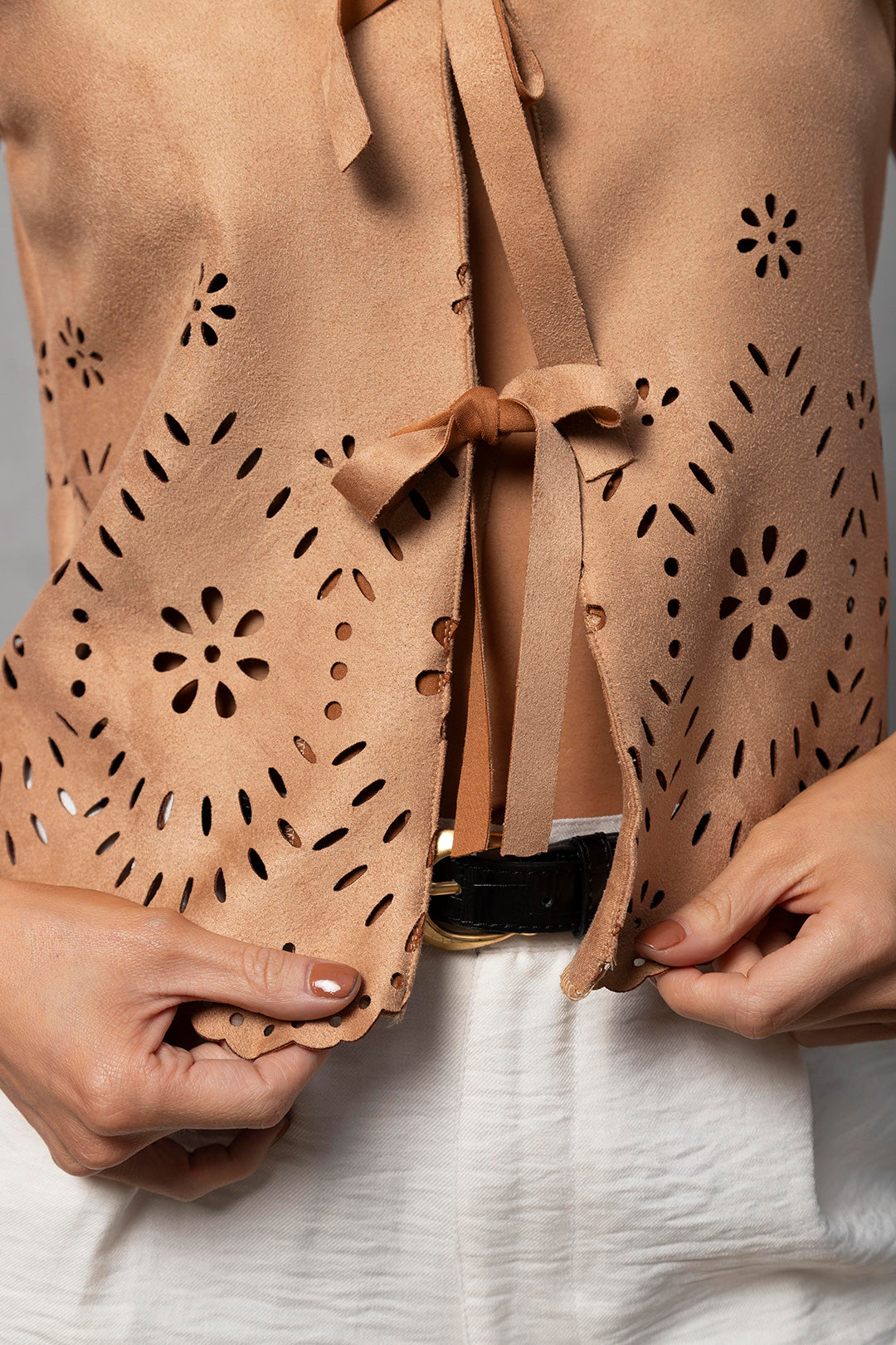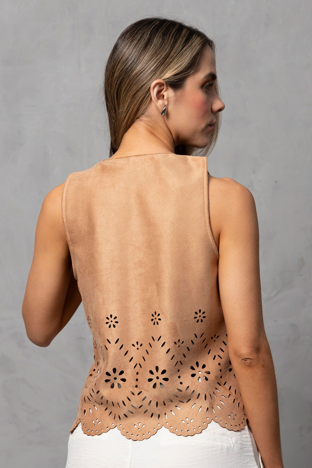 El Chaleco Osiris en gamuza combina un toque boho y un estilo moderno y versátil. Confeccionado en una suave gamuza sintética, suave al tacto y con una caída ligera. Sus lazos frontales permiten ajustarlo según tu preferencia. Una prenda ideal para usar sobre tops básicos, camisas o vestidos, elevando cualquier look casual o semi-formal.