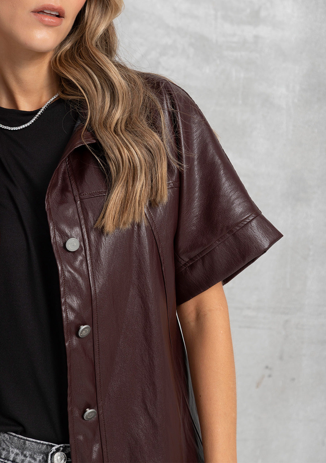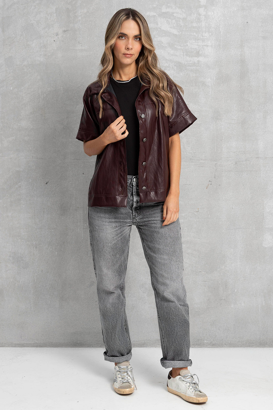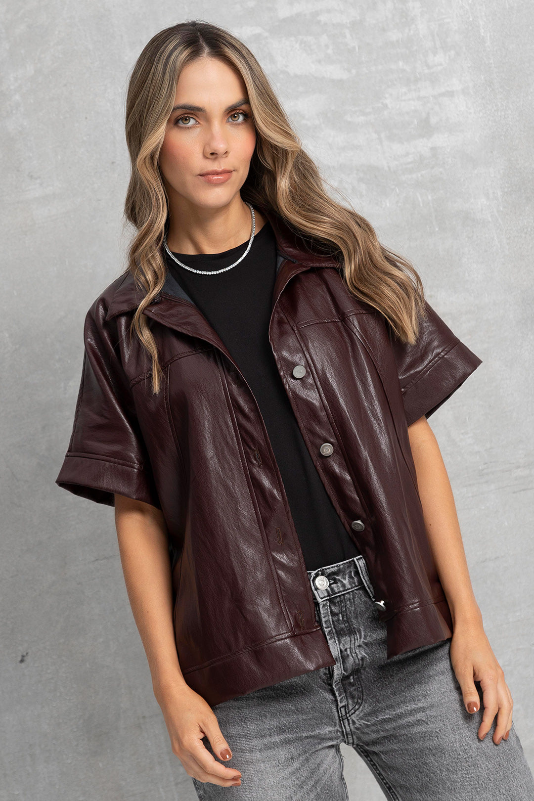El Chaleco Atenea vino tinto con mangas cortas, cuello tipo camisa y botones. Se puede usar cerrado como protagonista del outfit, o abierto para un look más relajado y casual. Con textura suave y un acabado que imita el cuero con un brillo sutil. Es una prenda que se combina fácilmente con jeans, pantalones estampados o vestidos. Ideal para cualquier look casual o de fiesta.