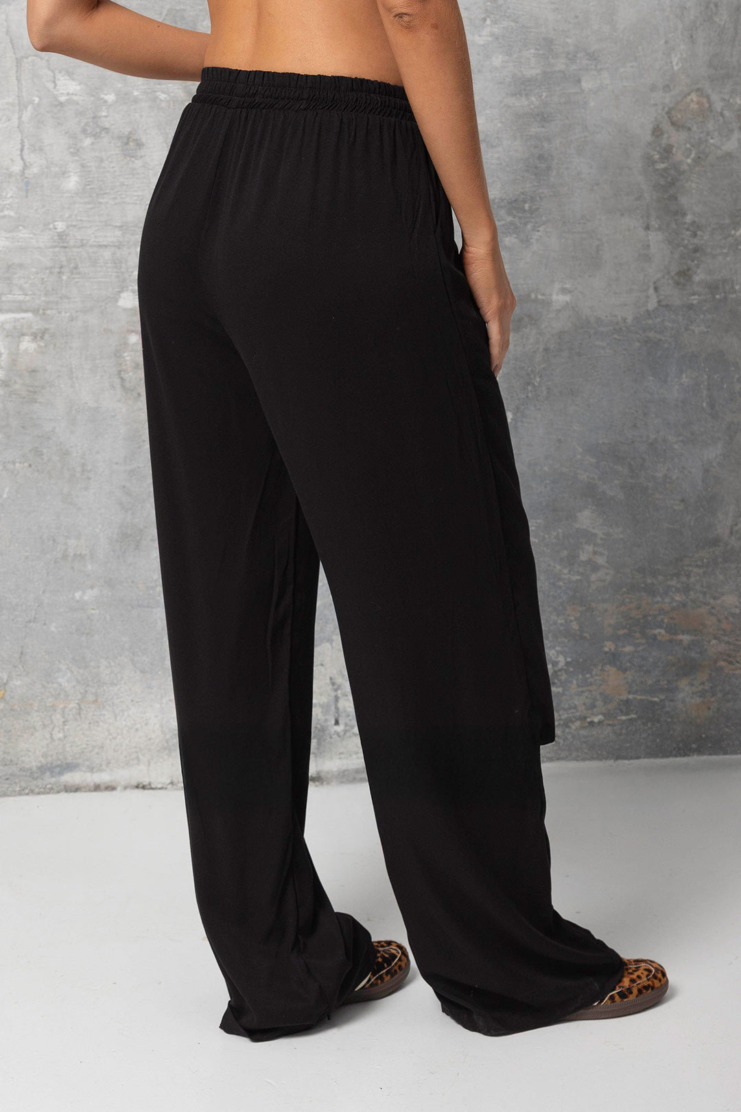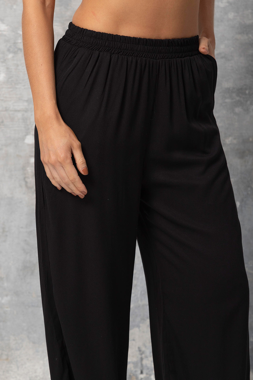 El Pantalón Gaby de silueta amplia para mujer es sinónimo de frescura y comodidad. Confeccionado en una tela ligera y fluida, su diseño con pretina elástica y pierna amplia garantiza comodidad durante todo el día. El color negro aporta un aire relajado pero elegante, ideal para combinar con camisas neutras, camisetas básicas o crop tops.