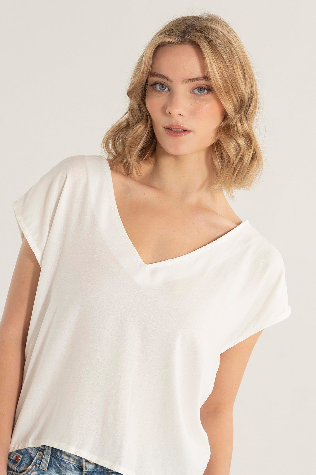 Nuestra camisa básica blanca para mujer, tiene una silueta amplia, confeccionada en rayón ligero que destaca por su frescura, caída natural y movimiento. Tiene escote en V al frente y en la espalda, que le da un toque sofisticado y diferente a un básico de todos los días.