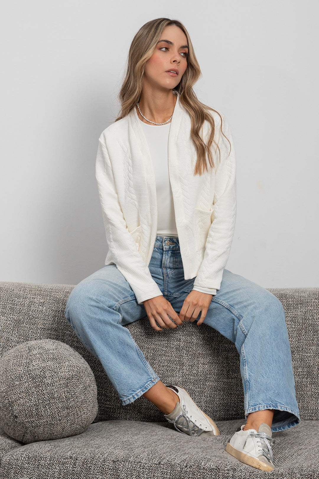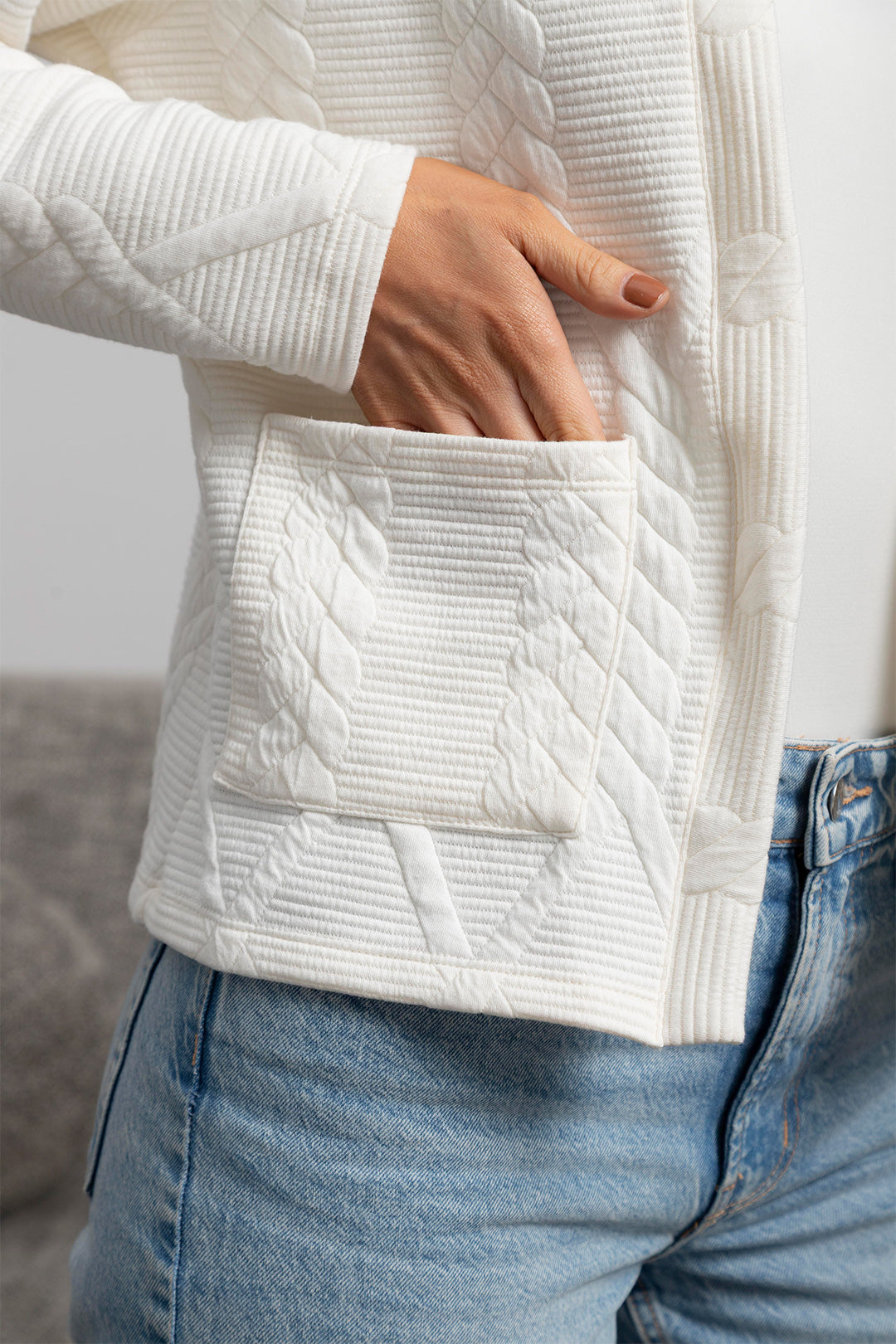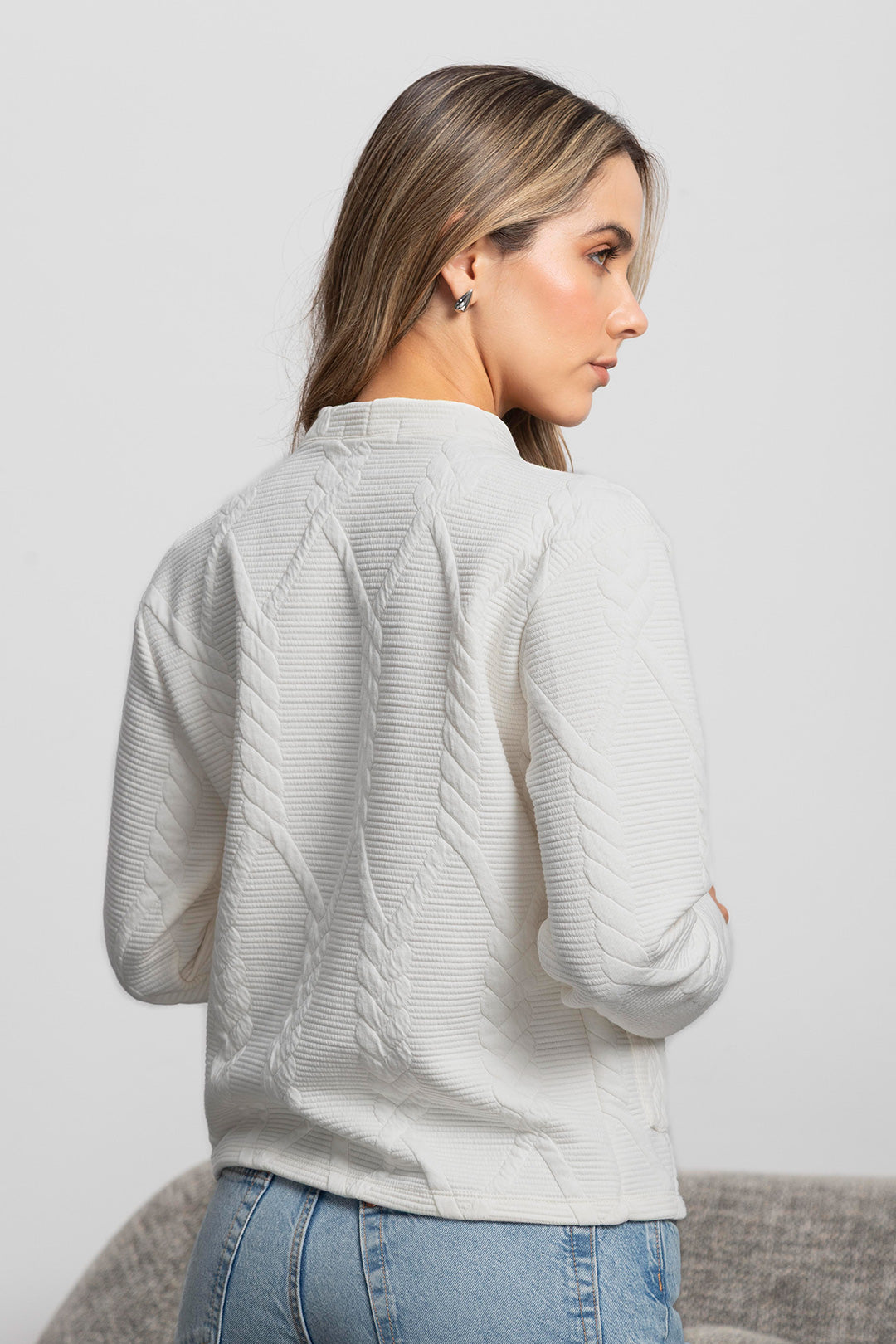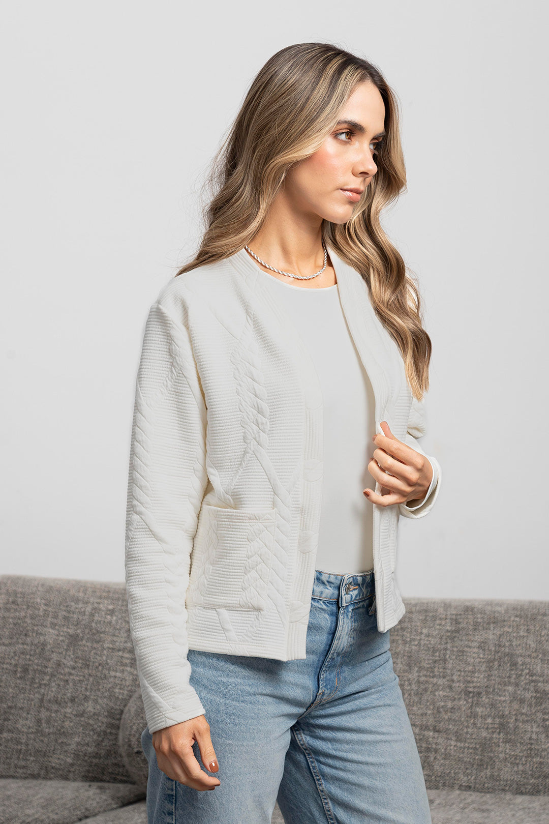 Nuestro cárdigan Lucía en tono marfil es una prenda clásica y femenina con una textura tejida con relieves tipo trenzas que aportan dimensión y un diseño atemporal.  Perfecto para usar abierto o cerrado con un gancho nodriza según la ocasión.