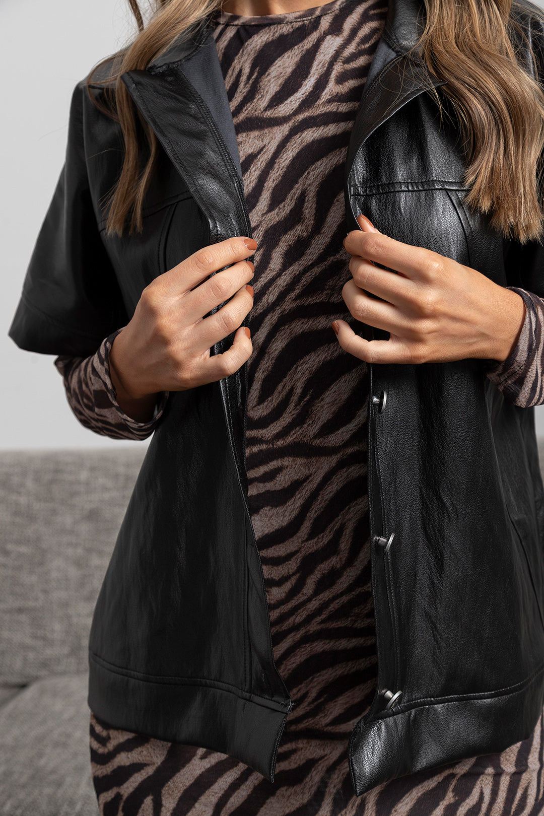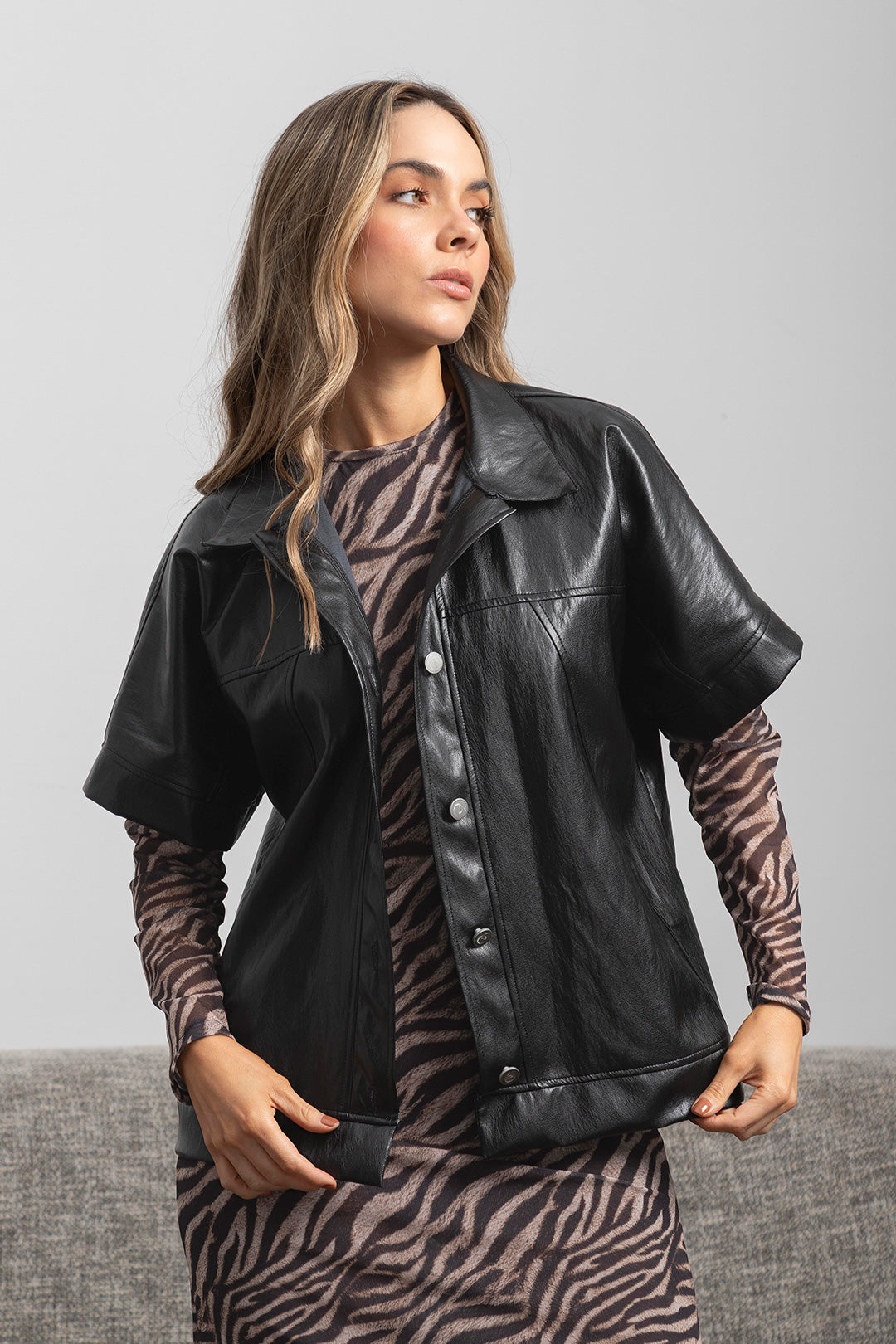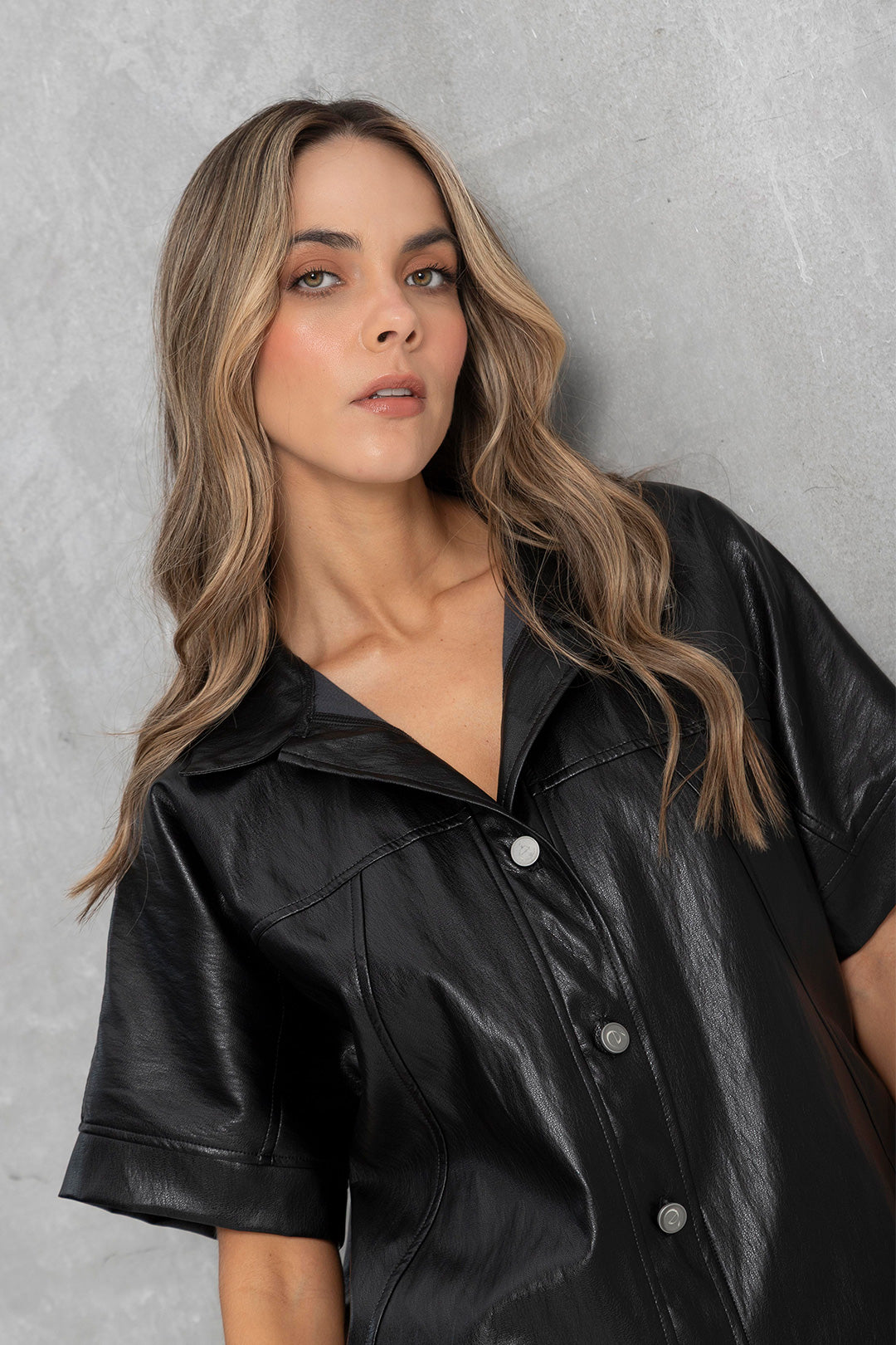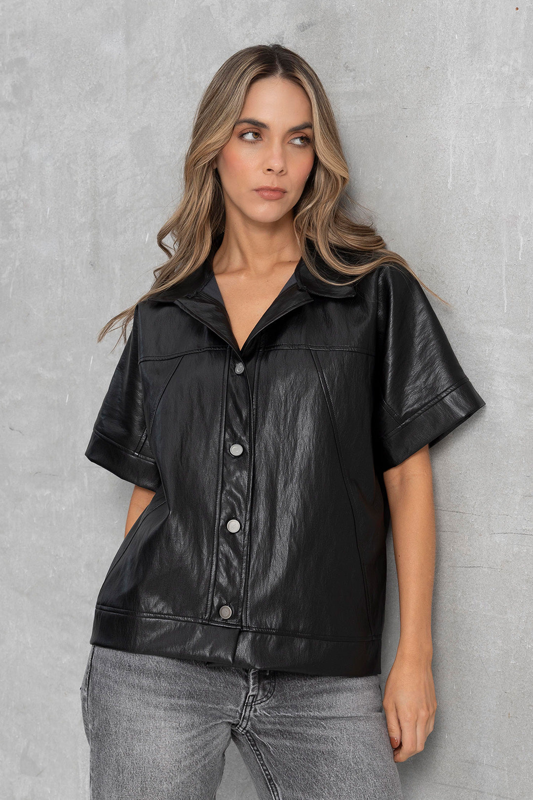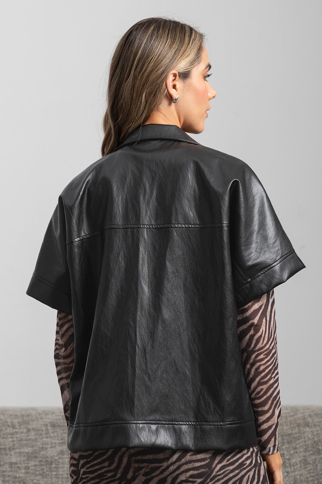 El Chaleco Atenea negro con mangas cortas, cuello tipo camisa y botones. Se puede usar cerrado como protagonista del outfit, o abierto para un look más relajado y casual. Con textura suave y un acabado que imita el cuero con un brillo sutil. Es una prenda que se combina fácilmente con jeans, pantalones estampados o vestidos. Ideal para cualquier look casual o de fiesta.
