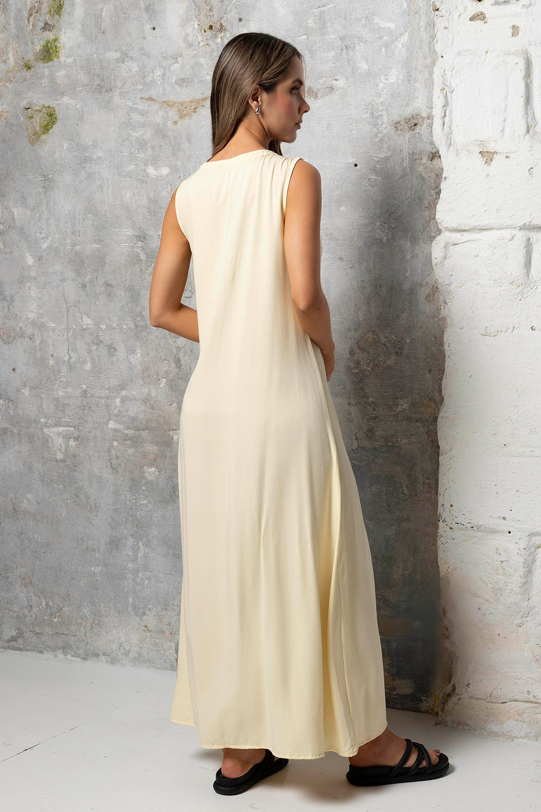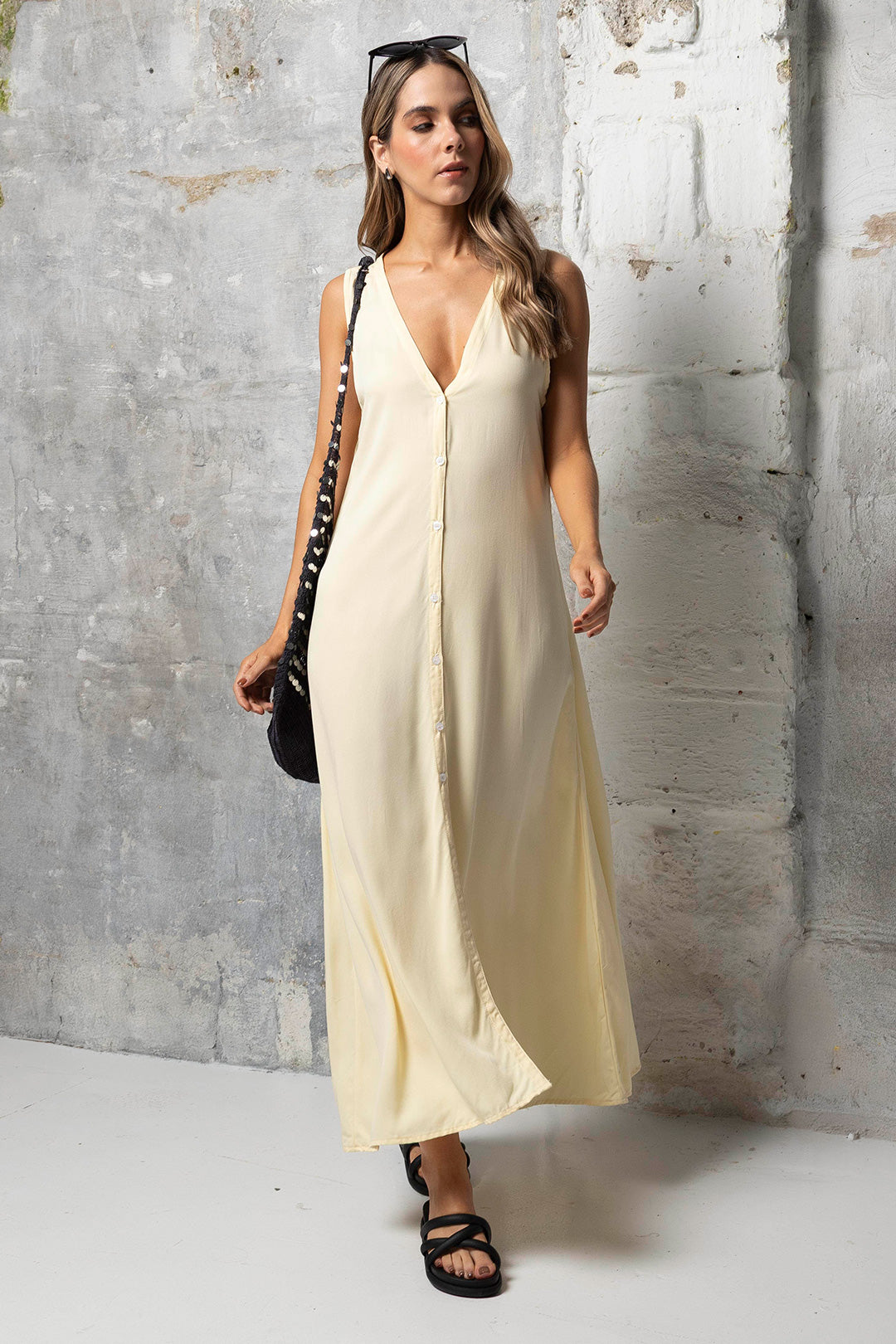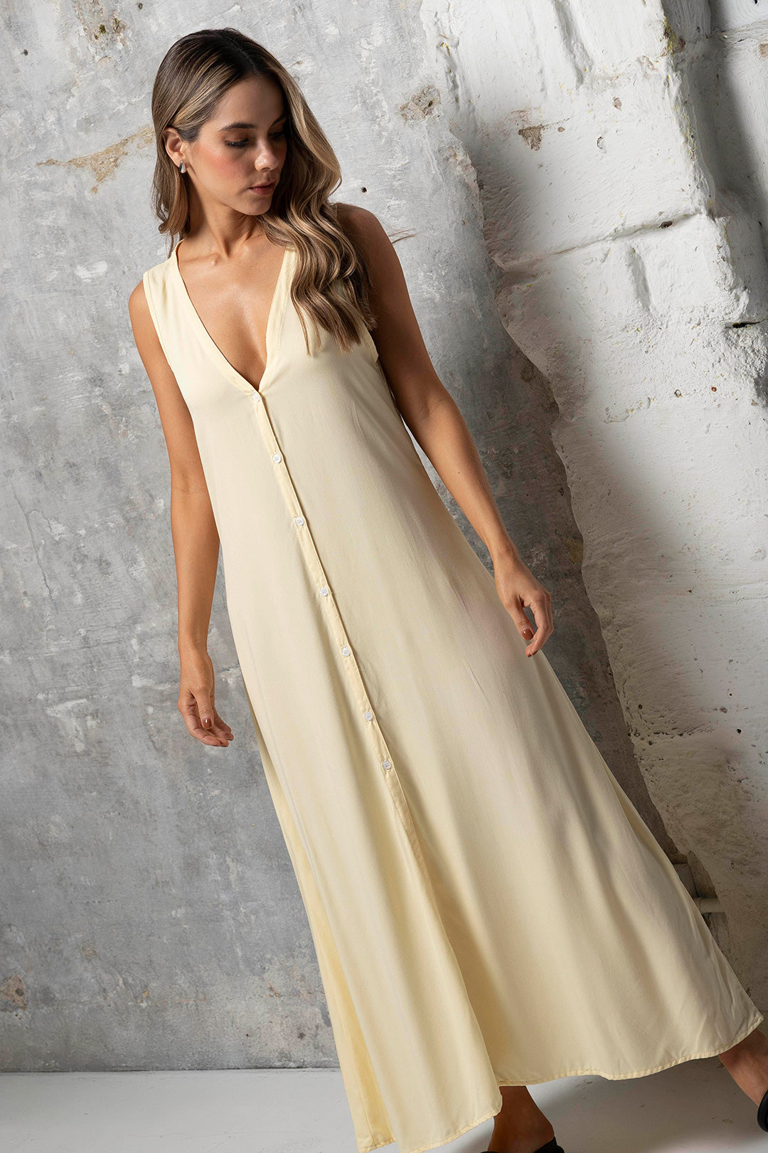 Nuestro vestido Sara largo Butter Yellow es una pieza sofisticada y atemporal que se convertirá en un básico de tu clóset. Confeccionado en una tela suave y fresca, con escote en V que estiliza la figura, botones al frente y una abertura inferior que añade movimiento y sensualidad. Su diseño sin mangas lo convierte en una opción ideal para climas cálidos o para combinar con chaquetas en climas u ocasiones más frías. Perfecto para eventos formales o informales gracias a su versatilidad.